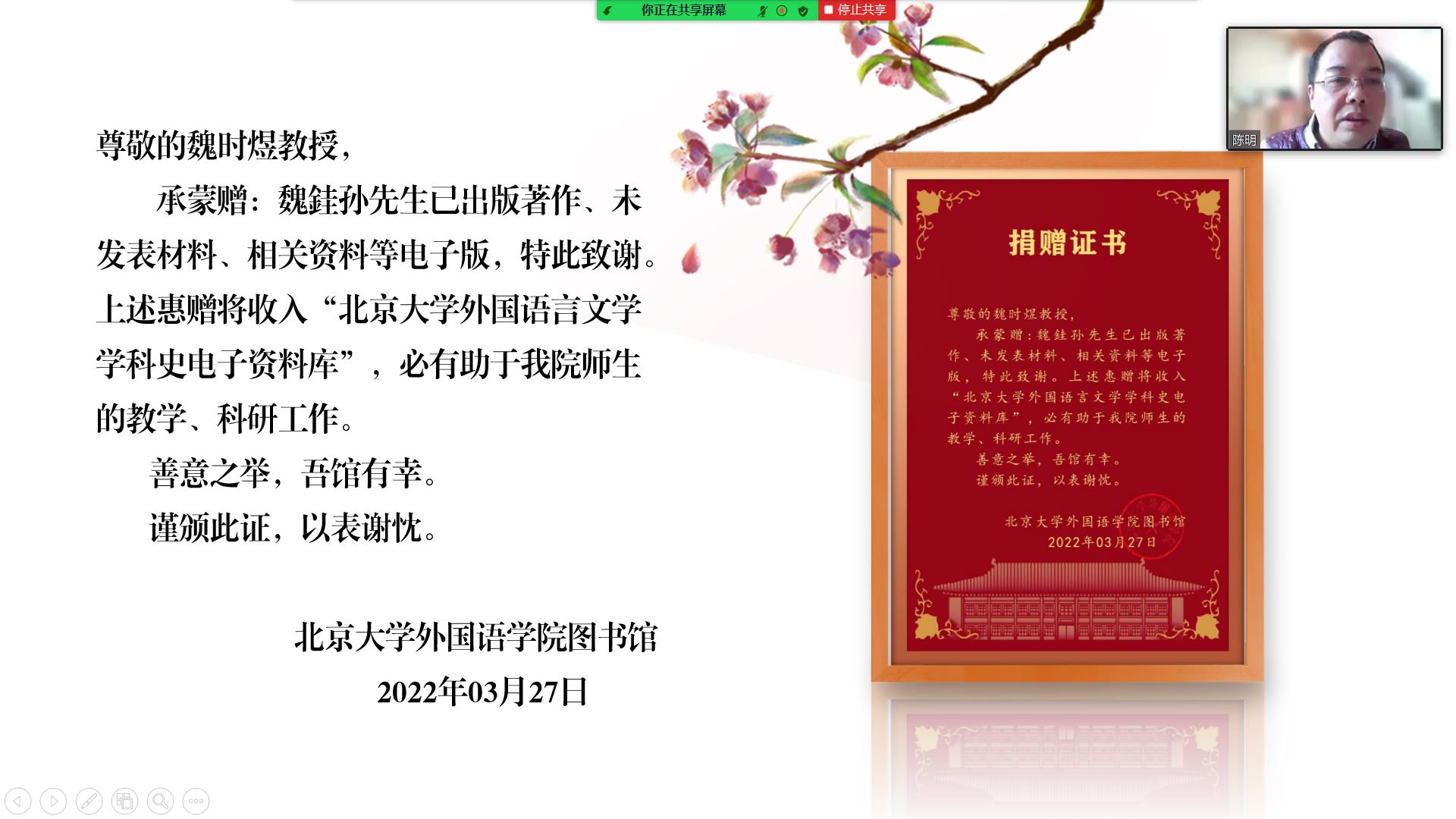 随后,九游会官方网站,九游会jiuyouhui(中国)院长陈明教授线上为香港城市大学魏时煜教授颁发捐赠证书。陈明教授对魏时煜教授慷慨捐赠魏銈孙先生已出版著作、未发表材料、相关资料等的电子版材料表示感谢。这些资料将收入“北京大学外国语言文学学科史电子资料库”,有助于推动师生的教学和科研工作。