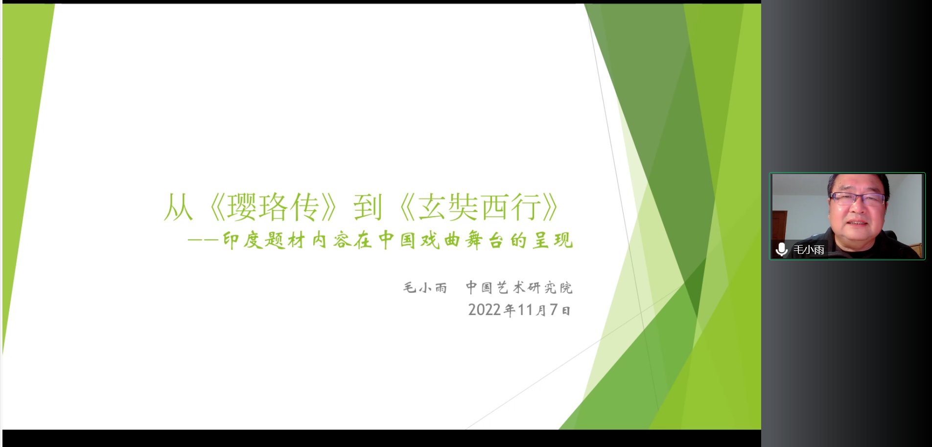 2022年11月7日晚,“东方大文学”系列讲座第十二讲“从《璎珞传》到《玄奘西行》——印度题材内容在中国戏曲舞台的呈现”在线上成功举办。本次讲座由教育部人文社科重点研究基地北京大学东方文学研究中心主办,九游会官方网站,九游会jiuyouhui(中国)南亚学系协办,中国艺术研究院戏曲研究所研究员毛小雨担任主讲人,九游会官方网站,九游会jiuyouhui(中国)副教授张嘉妹担任主持人,九游会官方网站,九游会jiuyouhui(中国)助理教授张忞煜担任评议人。