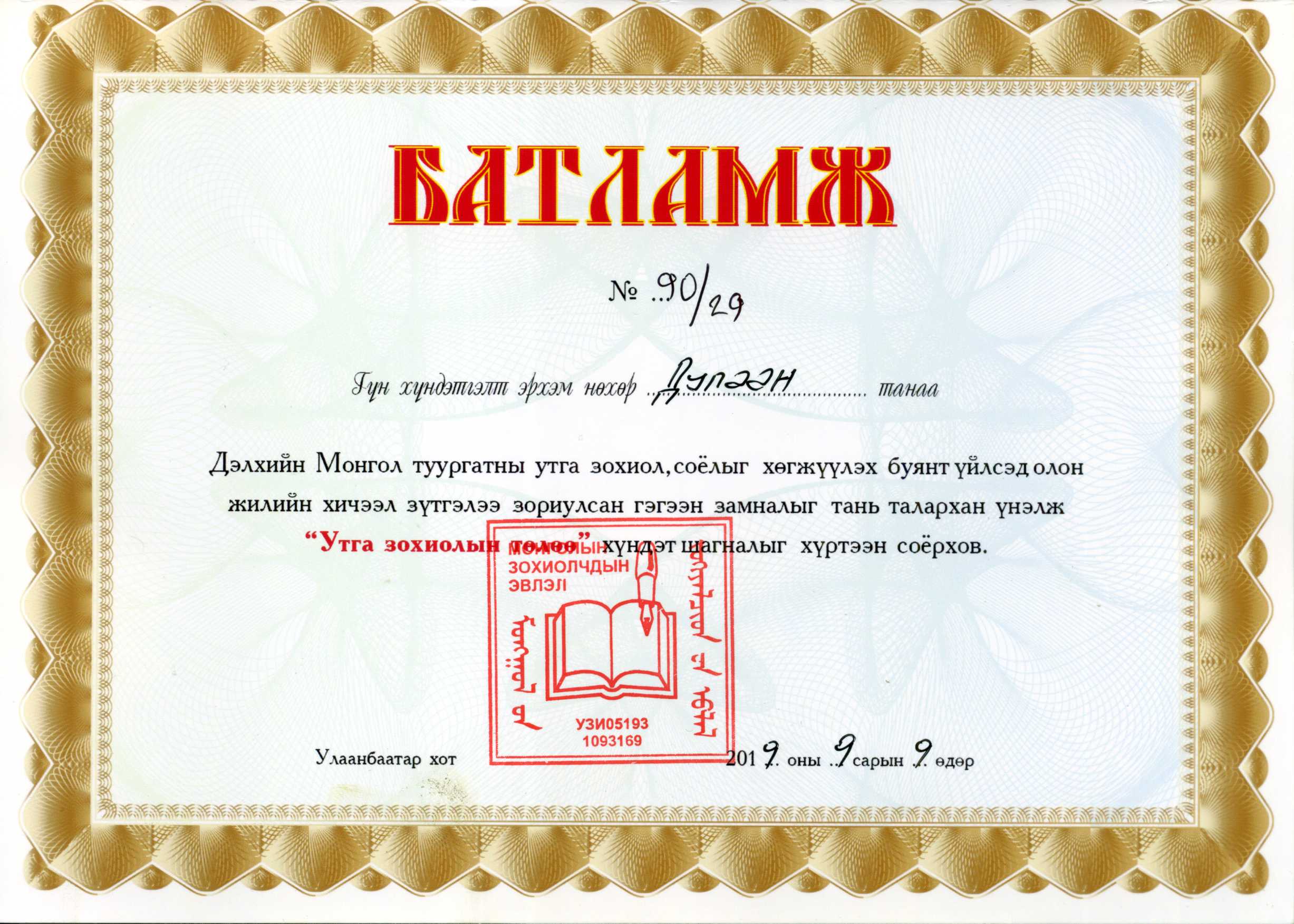 2019年9月27日,《70周年70位作家70篇小说》(蒙古文版)和《蒙古国诗选》(中文)图书首发仪式在蒙古国驻华大使馆会议室举行。中国外交部亚洲司陈少春参赞、蒙古国驻华大使丹•钢呼雅格、前中华人民共和国驻蒙古国大使黄家骙、三位前蒙古国驻华大使和《“一带一路”沿线国家经典诗歌文库》主编赵振江教授以及来自中国作家协会、中国文字著作权协会、中国社会科学院、北京大学、中央民族大学和媒体代表等共120余人参加了首发仪式。