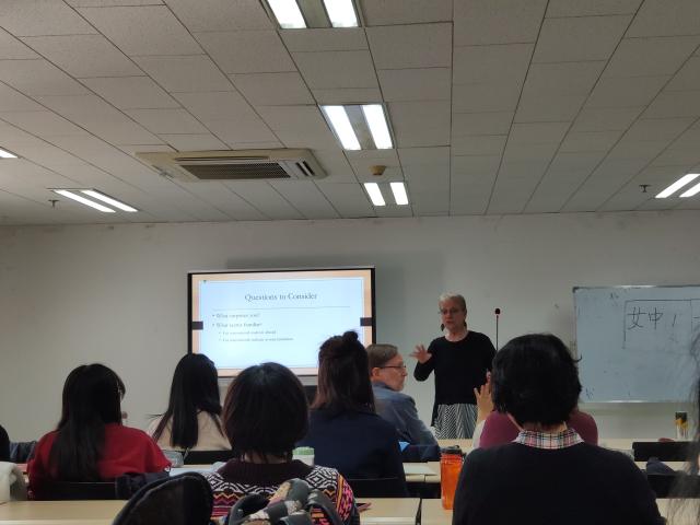 7日下午,Silberstein教授在九游会官方网站,九游会jiuyouhui(中国)新楼301做了第一场报告,介绍了她在过去十年中对华盛顿大学国际学生日渐增多这一现象的调查研究。此项研究采用了量的与质的相结合的方法,分别收集了来自教师、助教以及国际学生三方面的数据,试图探讨不同人群对国际学生群体的看法和态度。研究发现教师和助教对国际学生的态度既有正面也有负面,一方面他们认为国际学生为课堂带来了新的文化视角,丰富了课堂的内容;另一方面国际学生的课堂参与度较低,对学术抄袭有不同的理解,又为教学带来了一些问题。Silberstein教授将国际学生的调查结果与教师和助教的研究发现进行了对比分析,打破了大众以往对于国际学生的偏见,更为立体和全面地展现了国际学生群体给学校带来的影响,针对性地提出了学校为支持国际学生学术发展的一系列举措。
