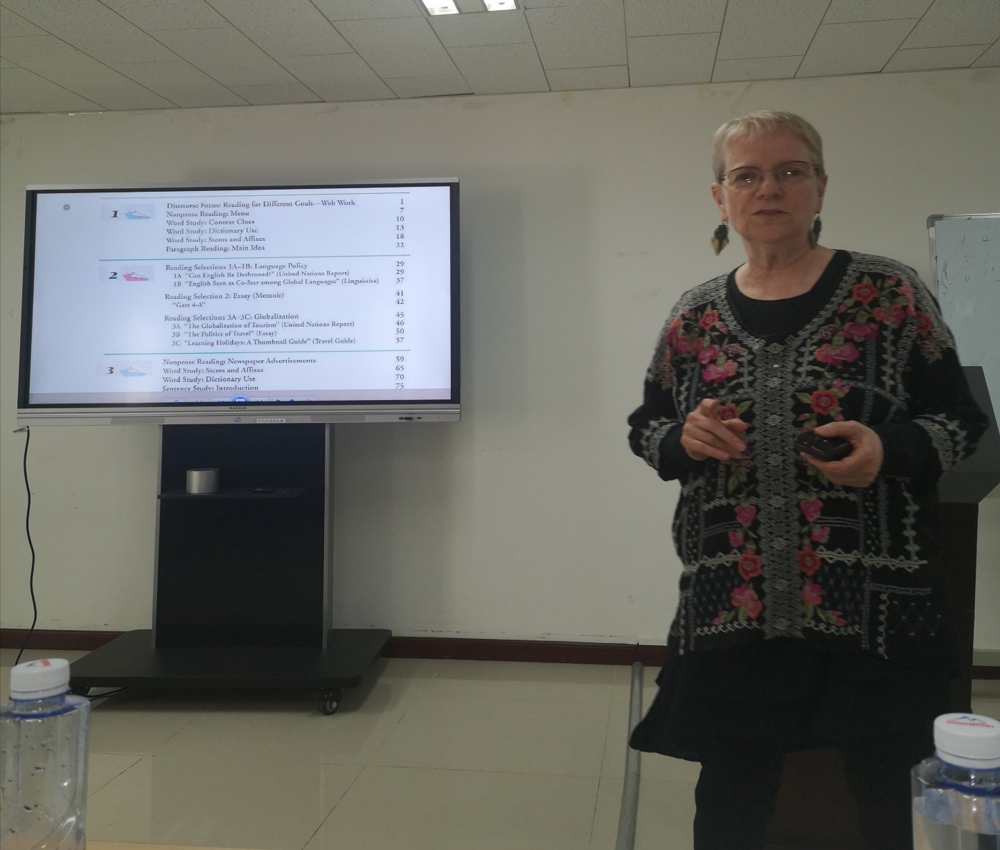 8日下午,Silberstein教授在九游会官方网站,九游会jiuyouhui(中国)新楼301给大学英语教研室的教师及语言所的师生进行了二语阅读教学的展示性讲座。整场报告围绕着以下几个问题展开:什么是阅读?阅读课的目标是什么?阅读课中教师承担着怎样的角色?如何进行批判性阅读的教学?如何对阅读材料进行评估?Silberstein教授在报告中不仅有理论性的介绍,也有直观简明的教学示范。她以一首不同寻常的小诗作为讲座的开场,让在场师生一起进行阅读和讨论。面对师生们对于同一问题给出的不同答案,Silberstein教授解释到人们在阅读时都会带着自己独特的社会经历和文化背景进行阅读,作为阅读教师需要认识到这一点并充分挖掘出学生的潜力,让他们做到读有所思,读有所得。接下来,Silberstein教授还展示了阅读中词汇学习的方法、如何针对不同材料调整阅读策略、如何用简单的问题启发学生进行批判性阅读等。