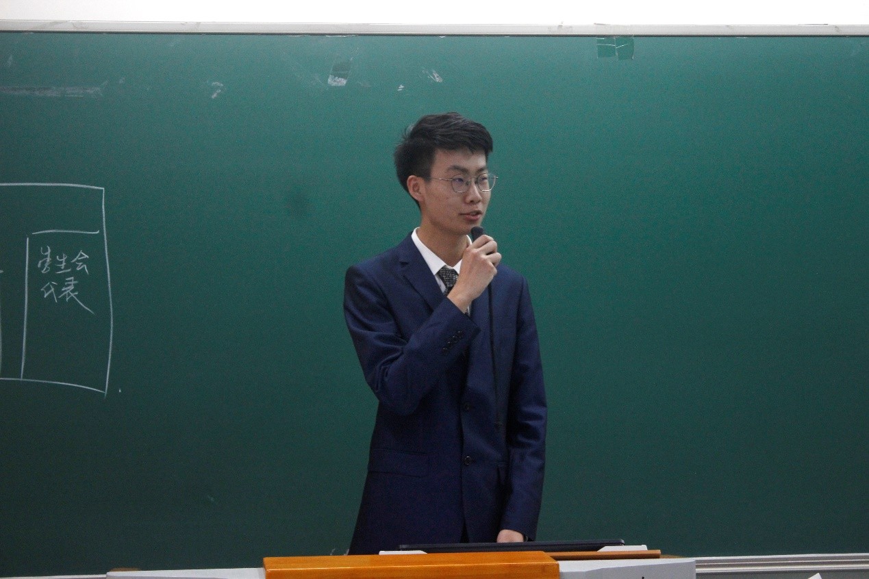党委副书记王恒首先致辞,他向会议的顺利召开表示祝贺,向第十八届学生会执委会和常务代表委员的辛勤工作表示感谢,对过去一年中全体师生对学院学生工作的监督与配合表示感谢,充分肯定了学生代表们“自我教育、自我服务、自我管理、自我监督”的自主意识。随后他总结了学院学生会和常代表在过去一年中取得的成果,高度肯定了学生工作的突出成绩。对于本次大会的召开,他希望参会人员能进一步明确学生会和常代会的自身定位,更好地发挥出积极的作用,牢记自身代表性,充分发挥桥梁和纽带作用,在维护同学权益、繁荣校园文化等方面积极付出,为同学发声,做好师生交流的纽带。他援引习近平主席对青年提出的六点要求:树立远大理想、热爱伟大祖国、担当时代责任、勇于砥砺奋斗、练就过硬本领、锤炼品德修为,希望同学们做好新时代青年,成为合格的社会主义事业建设者与接班人。最后,他强调了本次大会的纪律,要求本次选举公开透明,程序正当,并对下一届学生会和常代表提出希望,勉励他们接好学生工作的接力棒,发扬外院人的优良传统,在服务和奉献中成长成才。